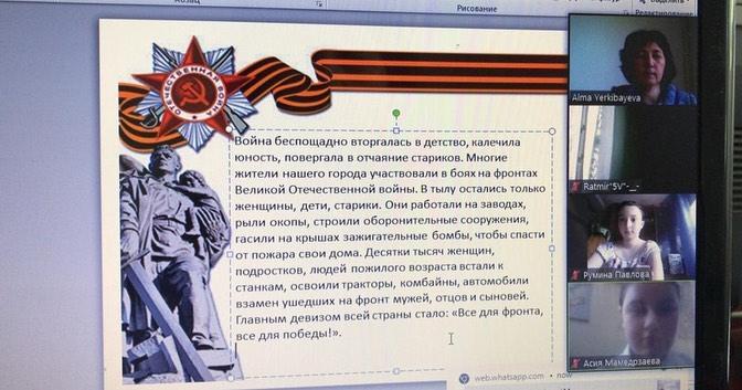 Ұлы Отан соғысындағы Жеңістің 76 жылдығын мерекелеу аясында 4 мамыр күні жалпы мектепішілік онлайн сынып сағаттары өткізілді. Әр сынып сағатының тақырыбын сынып жетекшілері анықтады. «Екінші дүниежүзілік соғыстың басты шайқастары», «Соғыс балалары», «Есімде, мен мақтанамын» сынып сағаттары мектептің барлық оқушыларын қамтыды.