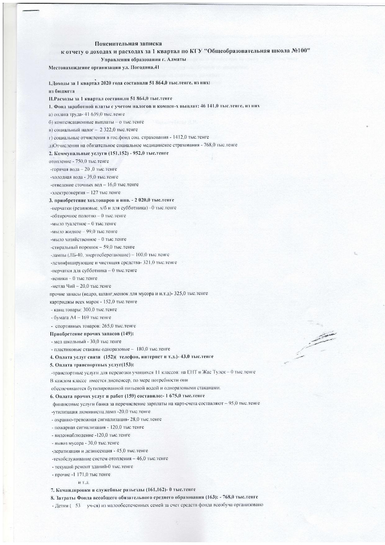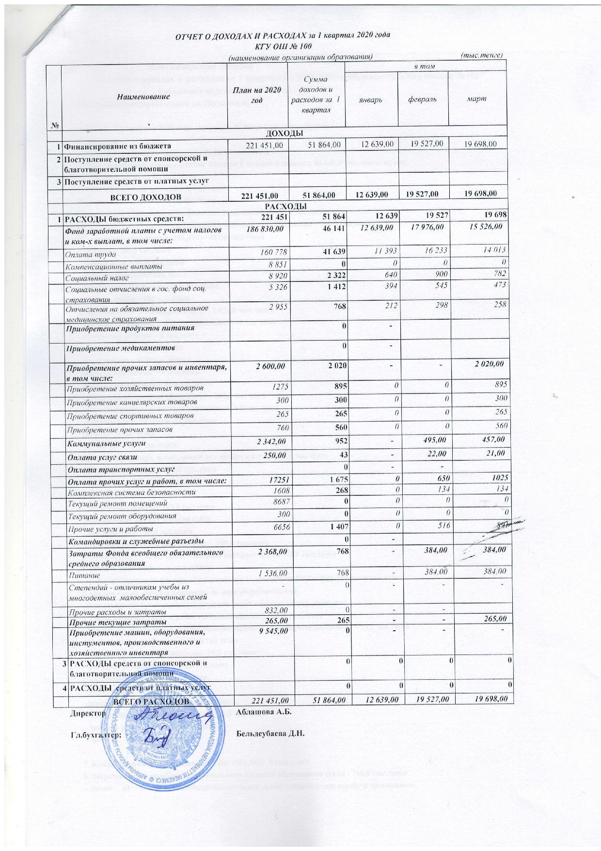 2020 жылдың 1-тоқсанындағы кірістер туралы есеп » Школа №100 г. Алматы