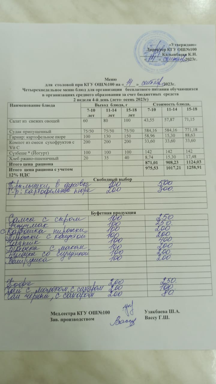 Ас мәзірі 14.09.2023 » Школа №100 г. Алматы