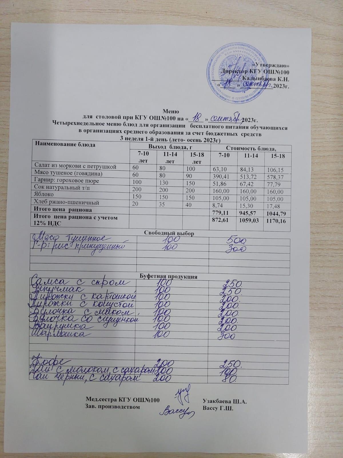 Ас мәзірі 18.09.2023 » Школа №100 г. Алматы