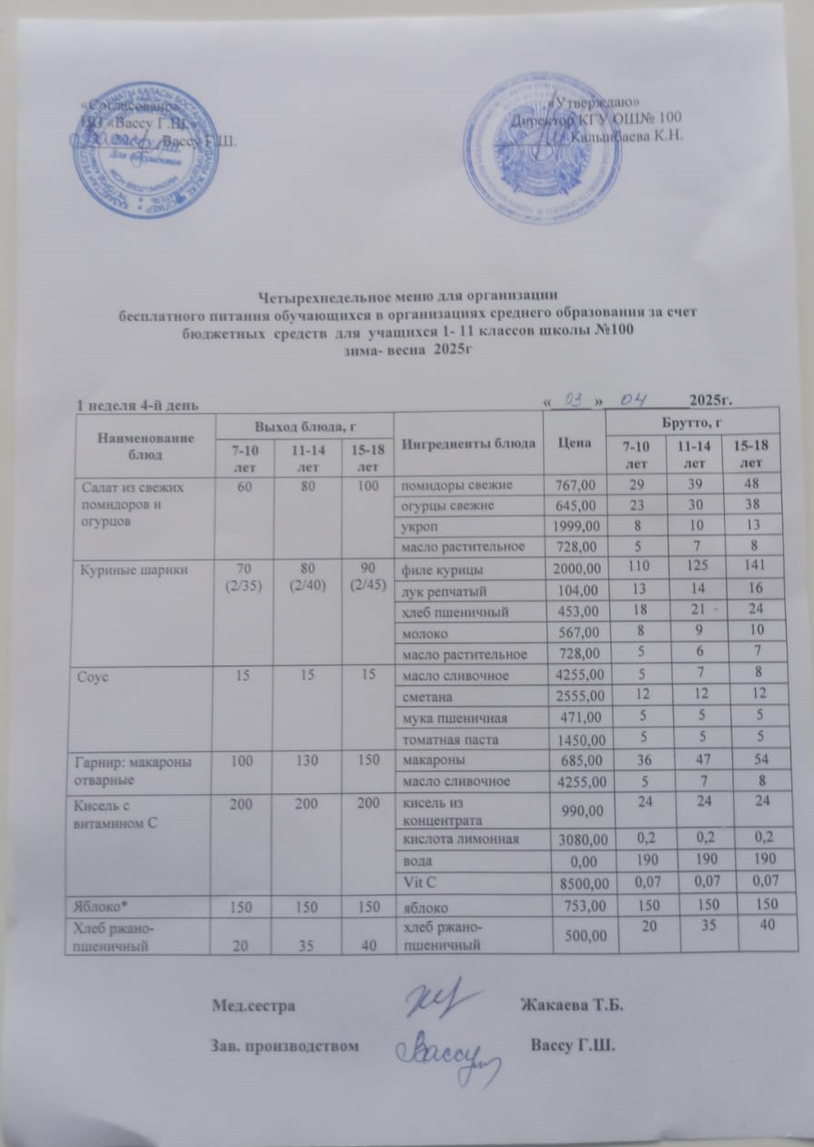 Ас мәзірі 1 апта 4-ші күн » Школа №100 г. Алматы