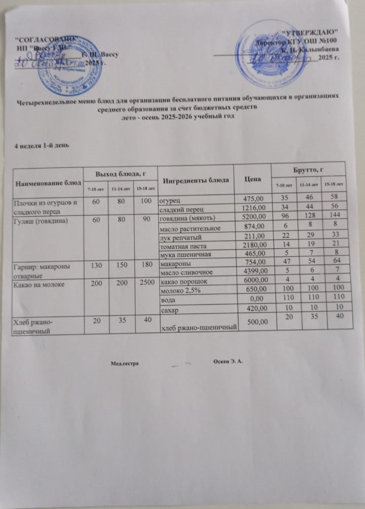 Ас мәзірі 4 апта 1-ші күн » Школа №100 г. Алматы