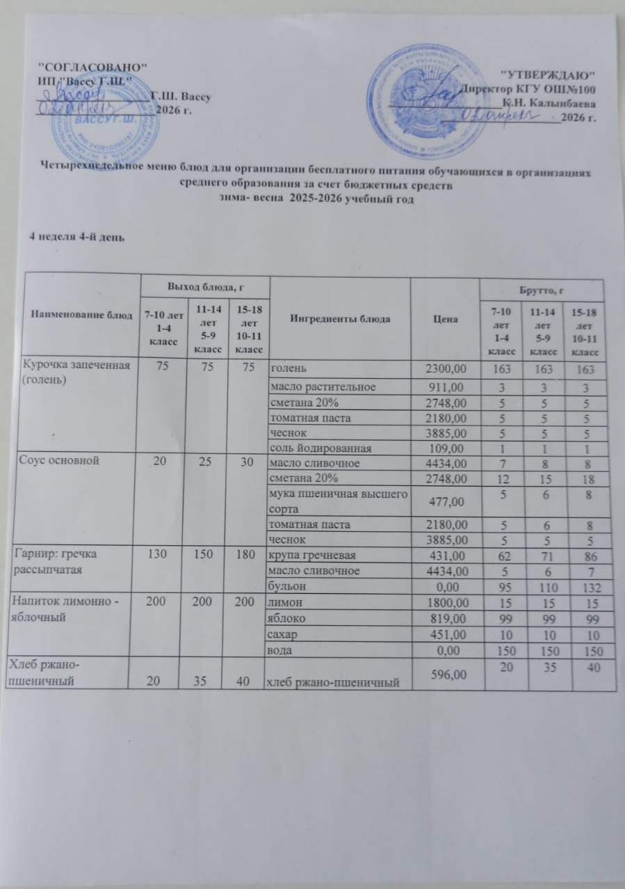Ас мәзірі 4 апта 4-ші күн » Школа №100 г. Алматы