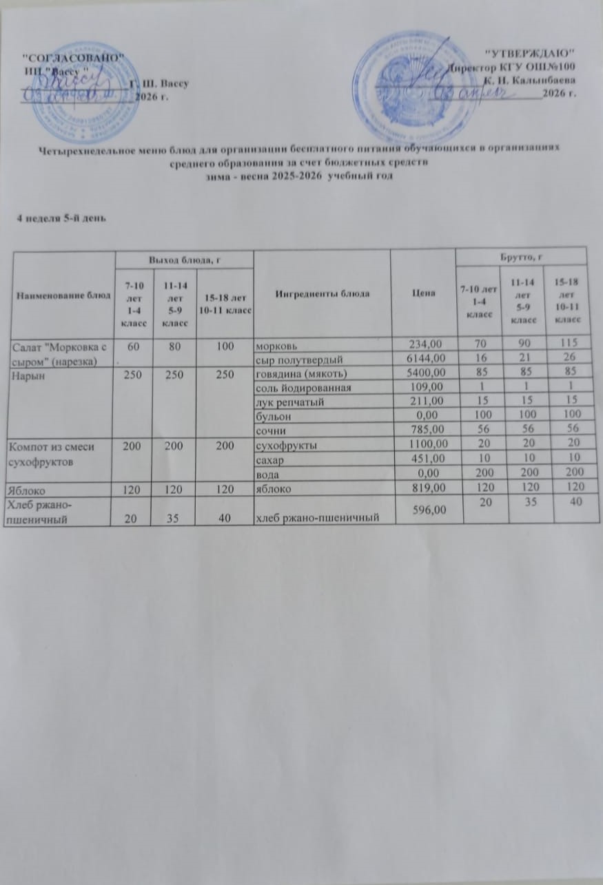 Ас мәзірі 4 апта 5-ші күн » Школа №100 г. Алматы