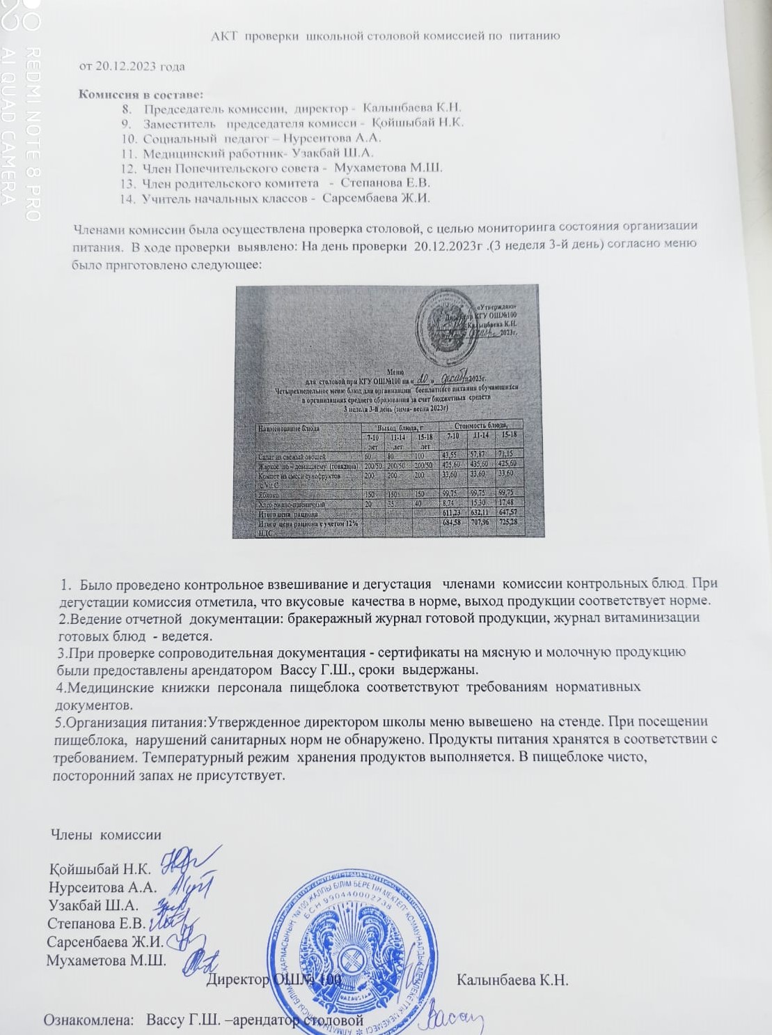 Мониторингтік комиссия мен ата-аналардың мектеп асханасын тексеру » Школа №100 г. Алматы